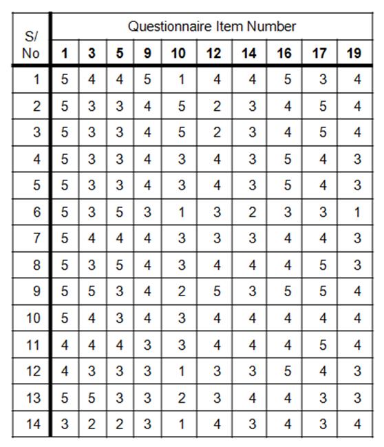Each row is a separate participant who completed the questionnaire, listed by their Serial Number (S/No), and their responses to each of the items. Each column is a questionnaire item. Because the items measuring intrinsic motivation were spread throughout the questionnaire, items 3, 5, 9, 10, etc., were the items that measured this particular variable.