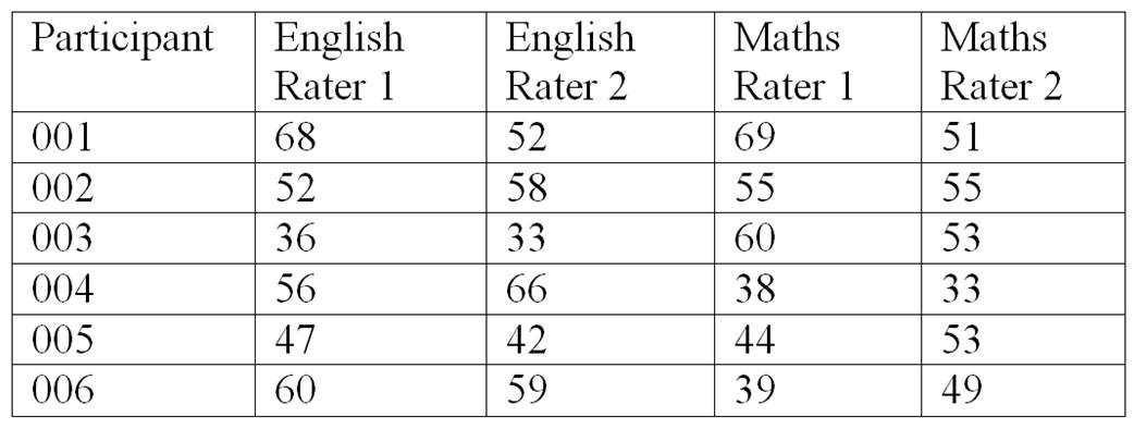 Rater 1 is the first teacher/researcher and Rater 2 is the second teacher/researcher. Calculate the Pearson's Product Moment Correlation between Rater 1 and Rater 2 on the English test, and again the Pearson's Product Moment Correlation between Rater 1 and Rater 2 on the maths test for the inter-rater reliability coefficients. A more advanced Kappa statistic should be used for inter-rater reliability for interview and observation data,