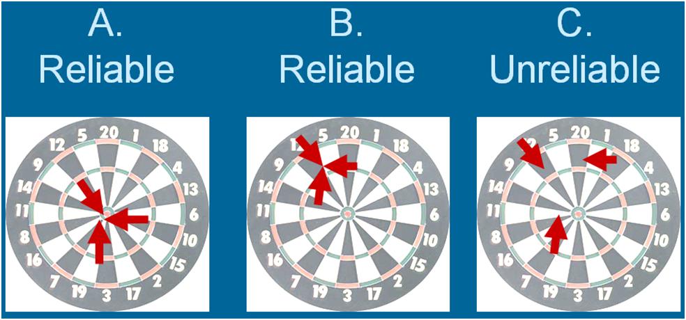 The first dart board, A, is reliable because all of the darts are together - the thrower is consistent and therefore reliable. Likewise, board B is also reliable because the darts landed together and are consistent. (This board is not valid because the darts did not hit the bulls-eye in the center, but it is reliable because it is consistent.) Board C is not reliable because the darts are all over the board - it is not consistent.