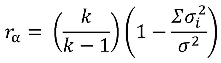 r stands for coefficient alpha; k is the number of items on the instrument that measure that variable, sigma sub-i is the variance of one item, and sum of sigma squared is the variance of the total score for the entire variable. That's complex, so only attempt to use coefficient alpha if you have been well taught how to do it.