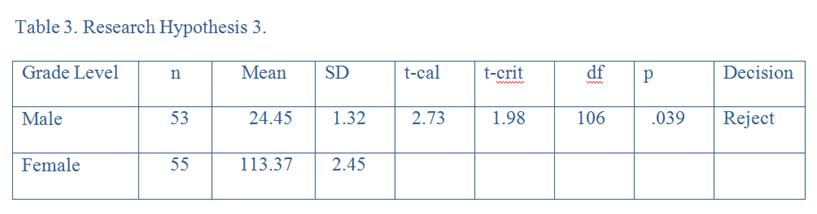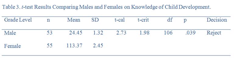First, the table has vertical rules. Second, the title of the table does not explain what the table represents. A more detailed title should be added. Below is a corrected version of the table. Note that this is not the "APA Format" for presenting the results of a t-test. The APA Manual does not give guidance on t-test tables. Indeed, it is often more common for t-test results to be written in the text instead of being presented in a table. For example, one might say "Females were found to have significantly more knowledge of child development than males (t(106) = 2.73, p<.05)." The degrees of freedom are placed in brackets immediately after the t. Then the t-calculated value is stated, followed by the signficance of the result (p<.05). However, in Nigeria, the table below is a typical method for reporting the results of a t-test.