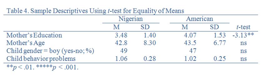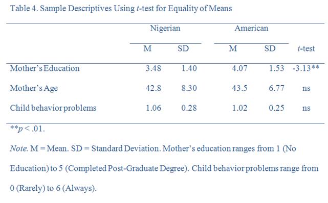 Most simply, the table is not double-spaced. However, the major problems with this table are more complex. First, the table does not explain what M and SD stand for. It is standard that M is Mean and SD is Standard Deviation, but this should still be clarified in a note at the bottom. More importantly, the mean for Mother's Education is 3.48. What does this mean? That mothers only attended 3.48 years of school? This is highly unlikely. The author probably coded education - perhaps 1 was none, 2 was primary only, 3 was secondary, etc. However, the reader does not know this! A note must be added explaining the coding. Mother's age is understandable. However, the next line is also confusing: Child gender = boy (yes-no; %). Presumably, the first part means that 49% of the Nigerian sample was a boy, but what does (yes-no; %) mean? Likewise, what does 1.06 mean for child behavior problems? Is this high (perhaps the range was 0 to 2), or is this low (perhaps the range was 1 to 6)? Without this information, this table is meaningless. Below is a corrected table with a note at the bottom to explain the table.